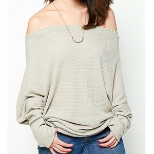 A must have for spring. This off the shoulder sweater is super comfy- chic effortless style. 35% Cotton, 65% Poly. NWT Smoke Free/ Pet Free Home