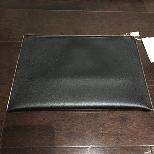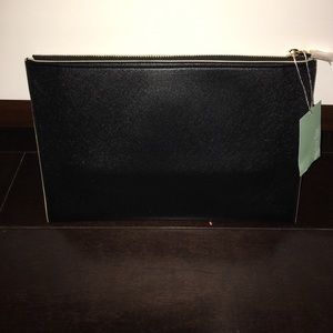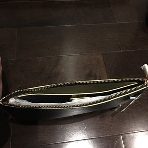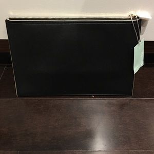 Black Deux Lux Azure Clutch with yellow gold hardware. House your cosmetics, change, cards and phone inside of this Azure pouch with ease. Made of Deux Lux's custom vegan leather with contrasting piping and matching trim at zip closure. Measures 11.5" x 8". Elegant and simple clutch to match any outfit. NWT