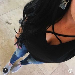 This black criss cross top is brand new and a perfect casual top for spring and summer. It's easy to dress up or down. Available in medium. I am modeling a medium in the last photo and it's slightly large on me. This top fits TTS.