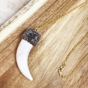5 Element hand made horn necklace. Handmade in India using the finest 18k gold filled chain with real bone (sourced by shamans, and sealed) and cubic zirconia pave designed horn. Each piece is one of a kind and handmade by one person through hours of work. The 5 Element line contributes to fair trade using the highest level of craftsmanship on earth in designing these unique one of a kind pieces. Using the elements of gold, bone, and earth crystals each piece is custom and perfectly designed.