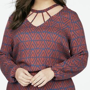 A fashionable patterned multi colored romper with a neck caged accent added to it. Long sleeve & cinched waist.