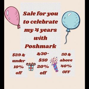 To all my Mentors & PFFs please help me share my sale. Celebrating 4 great years with Poshmark and all of you! Thank you all you're the best! @anawatboutique @jill555 @poshgarden @classyvintage @chicbirdie @fashionista21 @lauras_boutique @shoplittlebirdie @whatsleft @dinofinder @bellanblue @marcie0707 @rnicu00 @coolmum2 @wenrella