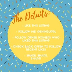Hi ladies (and gents)! I'm starting my very first follow game in hopes of getting closer to my goal of 15k followers! I would love your help and to help you increase your Posh following, too! Tag your PFFs, share, and please let me know if you have any questions! 💕 - shikha