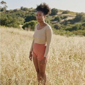 Has front pockets! 13.5 inch waist (across the top), 16 inch length. Color is a pale pink/nude. Zipper in the back.