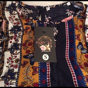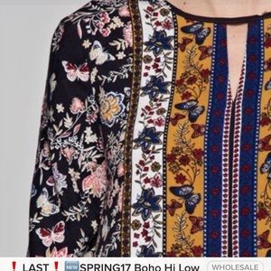 This is sure to get someone's attention! This vibrant print of stripes and florals combination is a winner! It has a unique hem line and three-quarter sleeves. Material content 100% Rayon. Measurements while laying flat: Bust S 17" LENGTH (front) S 30". Marked Free People for exposure.