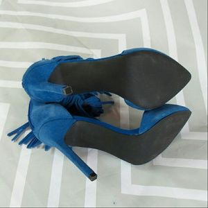 Beautiful blue suede fringed heels. Braided ankle cuff. Back zip. They are marked a size 8 but fit a bit large and could accommodate an 8.5.