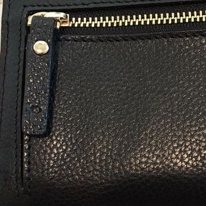 Kate Spade Credit Card Wallet. NWT, NIB. Textured Black Exterior, Smooth Leather Cream Interior. Leather., Approx. 6 3/4" x 3 1/2". Snap closure. Outside back zip coin compartment. Inside 4 full length bill compartments. 12 credit card slots and clear ID window. Gold tone hardware. Comes with authenticity card. Slight mark on exterior zipper pull. See photo. Please ask questions prior to purchase. 🚫trades.