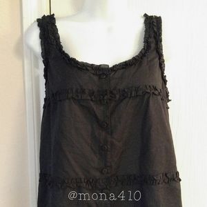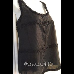 GAP Sleeveless Top in Black. Ruffles neckline/hemline, as well as two seams of the shirt. Top is a little shear. Size Large. Gently used, but still like new condition. No flaws that I have noticed as of this listing. Please, ask all questions before buying. Thank you!