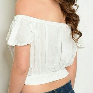 NWT. Super cute!! I love this one! Gusseted design so it stretches easily. Off white - off shoulder crop top. Lightweight, perfect for warm weather! Cut out front detail.