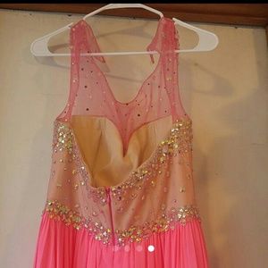 Prom dress size M fits like a Large. Has shear top with rinestones great condition only wore 1x paid 200$ at macys no flaws no rinestones missing.