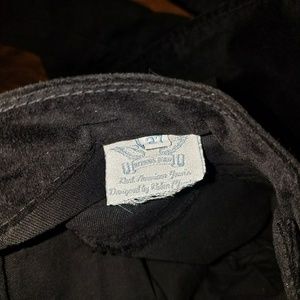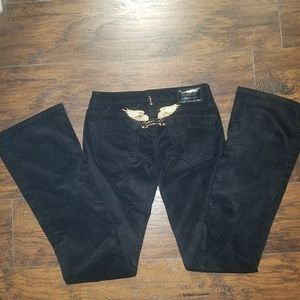 Robin's Jean "Garbot" Poplin. 5 pocket wide/flare leg made of stretch poplin. Maximum comfort, style and versatility. Black with gold signature wings. 100% authentic, straight from the manufacturer. Brand new, never worn. 33 inch inseam.