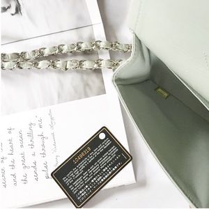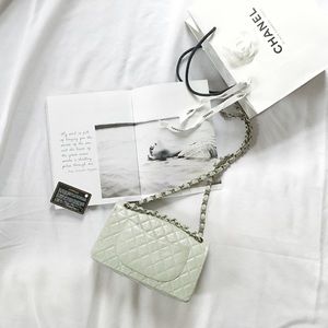 **CONSIGNED** Always Authentic🌸 PRICE FIRM CHANEL Lmtd Edition medium double flap w/ SHW. Made in France.Beautiful neutral sea foam/light mint.Perfect twist on a classic closet essential!Absolutely stunning& timeless!EUC: preloved:light marks/leather fading &slight age/glue marks on flap corner.Includes authenticity# perfectly intact,authenticity card,dustbag,box,shopping bag.*I personally style all pics,NO modeling* NO TRADE! Select CHANEL filter in closet for more pics.Bundle &save even more✅