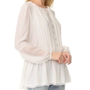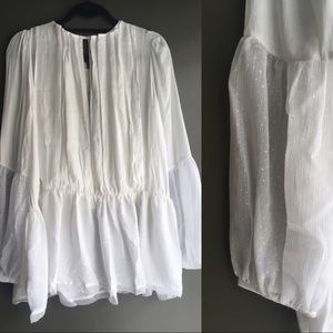 This ivory colored top is constructed with long gathered sleeves, has a sheer lower half and a crew neck with a lace embellished cutout panel down the front. Feminine chic / bohemian style, tunic length. Split back (up to waist). Down the middle of the chest and lower half of sleeves are sheer with tiny white polka dot print. Runs a little big. Originally $128, brand new with original FP tags attached. Available in medium. No PayPal, no trades.