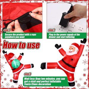 🧿Package Include: you will receive 5.9 feet height hanging Christmas Santa Claus inflatables, 5 LED lights, 1 blower fan with a working current voltage of 12V/0.8A, standard adaptor plug, manual and ropes; You just need to connect your blower fan to your Christmas inflatable and plug it in, cute inflatable Santa will show up in minutes