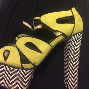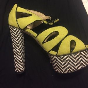UNIQUE neon green sandals- never worn but there are a few stains on the back of the shoe and a small one on the side from storage- please see pictures. 6 inches with 2 inch platform.
