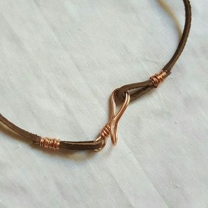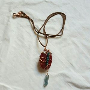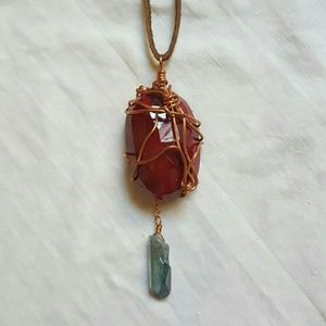 Handmade by me! GORGEOUS deep red oval shaped raw ruby, cut with beautiful facets, wrapped in copper wire w/small round turquoise beads & light blue "crystal" dangling below. Crystal portion is glass cut in the form of a crystal, & has a gorgeous "rainbowy" appearance in the light. Hanging on brown leather cord w/ handmade copper wire clasp. 26 inches long. Pendant is 3 1/2 inches long from top of bail to bottom of crystal. Ruby is just over 1 1/2 inches long, 1 inch wide & 5/8 inch thick.