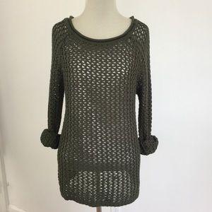 Because of its beautiful army green color and its lightweight loose knit, this sweater is almost seasonless. Pair it with a long sleeved tee and riding boots in the fall and a cami/bralette and white cutoff shorts on cooler spring and summer days! Size M. Approx. 20” bust, 27” long from shoulder to hem. NWOT.