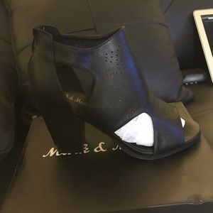 "Perforated ankle booties with side cutouts, an open toe, and a back zipper enclosure.