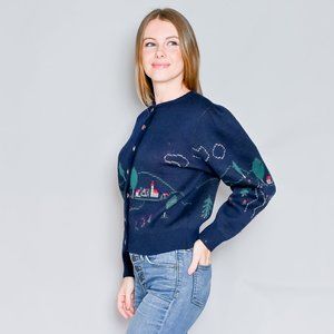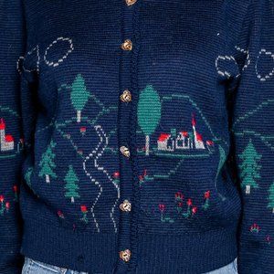Vintage wool knit cardigan by Silber-Distel Trachten cardigan with heart-shaped buttons (wooden look), Austrian village scene.