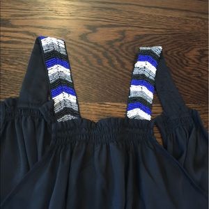 Such a cute dress! Too small for me. Beaded shoulder straps. Criss cross top with snap. Elastic waist. Smocked detail. Racer back style. One side of tag came loose but can be removed. 100% polyester.