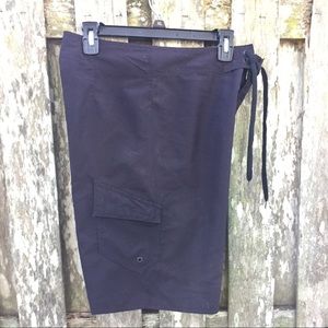 These black board shorts have only been worn a few times. They are a waist size 30. The waistband is neon green. There is only a pocket on the left hand size, and it Velcros closed. The fly similarly velcros closed, ties, and has an extra sticking or fabric to prevent ~accidents~ when waves take your shorts down- or the diving board! The Hang Ten logo is a pair of footprints, which is embroidered on the pocket.