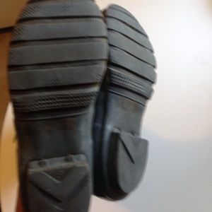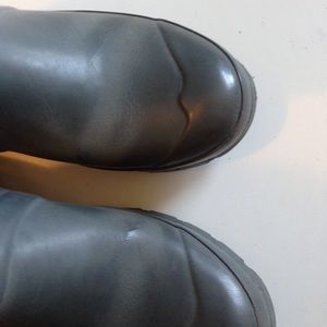 Gray riding boots. Emblem on front. Buckles on side. Some cracks on vamp. Not through the lining. Wear on heels. Some discoloration. Stylish & cute