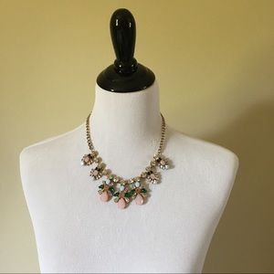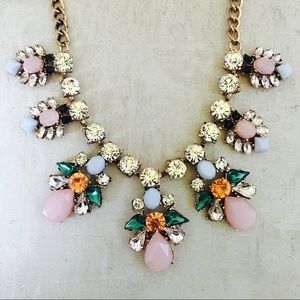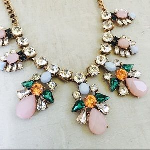 Beautiful crystal necklace features petal drops and antiqued golden chain. Crystal, opaque powdered blue, semi-opaque pink, crystal green and coral stones. 19" + 2.5"