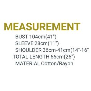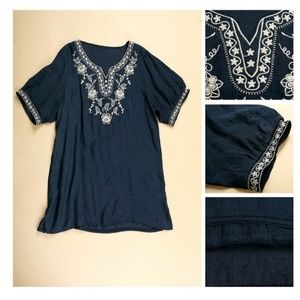 Material: cotton/rayon. Silvery gray embroidery on front and sleeves. Loose fit. Lantern sleeve style. Lightweight for warm weather. OSFM. See pic 4 for measurements, please refer to this prior to purchasing. May be 0.5" to 1" difference due to manual measurements.