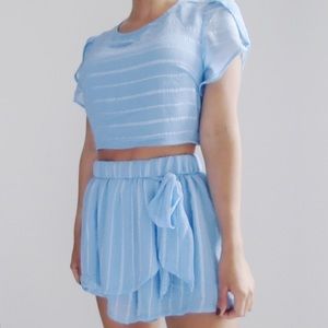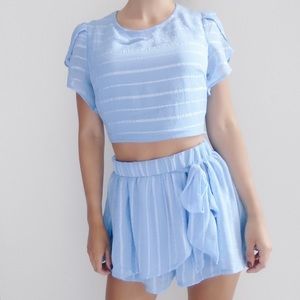 Two piece light blue set with stripes detailing. Layered capped sleeves and wrap tie skort. Crochet back with lace-up detail and tie. 100% Polyester with 100% Rayon Lining. *Modeling size Small*
