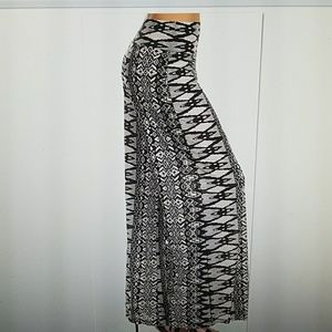 NEW Super cute and comfy black and grey Aztec geometric wide leg slimming Palazzo dressy pants. Elastic waist. 92% polyester 8% spandex. Small medium fits approximately sizes 2 to 7 large extra large fits approximately sizes 8 to 13. Inseam is 32 inches
