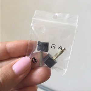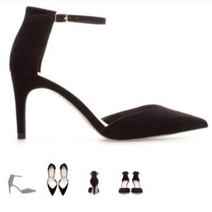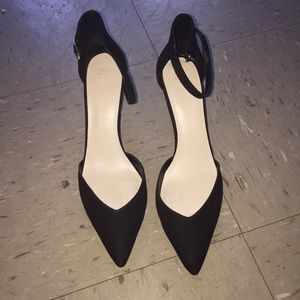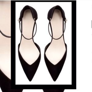 Black pointy toe low heel with thin buckle strap. The bottoms have collected a lot of dirt as these once had non slip grip pads sticking to the bottom. Otherwise in good condition and include two heel tip replacement caps.
