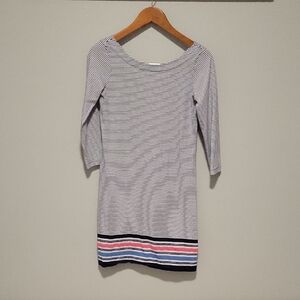 Black and Tan 3/4 sleeve shirt with silver bar embellishment on front collar. Very soft material and feels great to wear. Sits below hips. Nice condition.