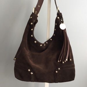Great shoulder bag for this fall! This Stuart Weitzman suede bag is in excellent condition. Brand new without tags. Has gold studded and fringe detail on sides. Has magnetic closures with inner pockets and adjustable buckle shoulder strap. Measurements (approx): 17" length x 11" depth x 5.5" wide