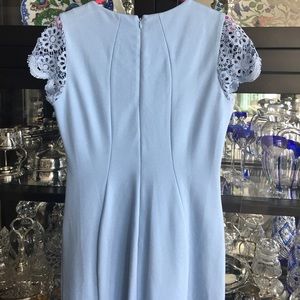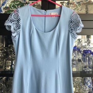 Light blue, fitted (zipper back) dress with lace cap sleeves perfect for a summer occasion!