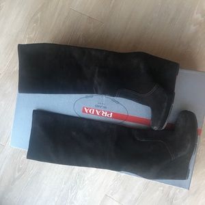 Prada Suede Wedge Boot; 4" covered wedge and 1/2" platform; 3 1/2" equivalent.; Approx. 16 1/2" knee-high shaft; 14" circumference; Interior side zip; Round toe; Leather lining.; Textured rubber sole; Never Worn
