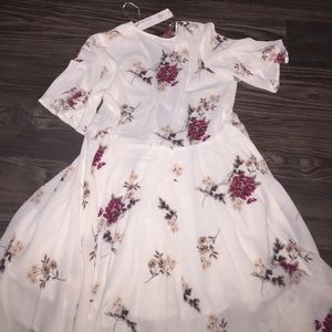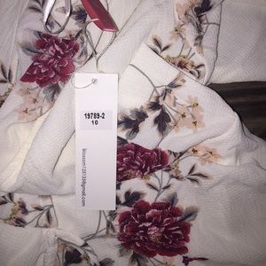 Brand new white floral wrap dress. It has burgundy and beige flowers on it and green leaves and it closes in the front with a snap button and a attached belt