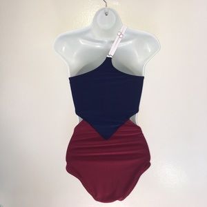 This hot one piece swimsuit features a sleepless, side cut out design, padded chairs. Great for any occasion, bust measures about 13 inches swimsuit when measures about 23 inches. Model is wearing a medium, runs a bit small but does a some stretch to it. Color: navy blue and maroon material: polyester and Spandex.. Recommended to get a size up