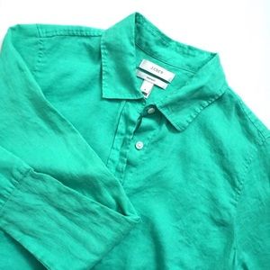 Cute mint colored linen button down by J. Crew. Look is cute when sleeves are rolled up and paired with distressed denim. #7061717