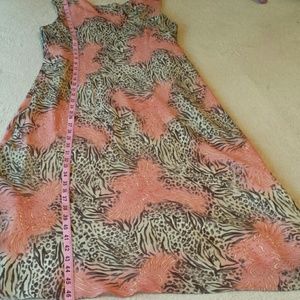 I bought this beautiful sleeveless dress in a boutique in Coligny Plaza, Hilton Head, SC. The sleeveless dress has a pretty hemline, a conservative v-neck, & it's fully lined. The matching blouse is sheer & it's sleeves are approx 3/4 length. I wore it once, to my best friend's bridesmaid luncheon. No holes, stains, pulls, pilling, or flaws. It's very nice and classy. I lost weight so it no longer fits me. Both pieces are size 14.