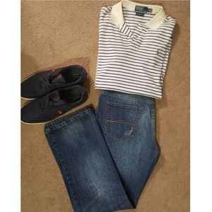 Thick mens jeans... with manufactured holes in the jeans. Great fit and lots of life left in them. Size 33/32.