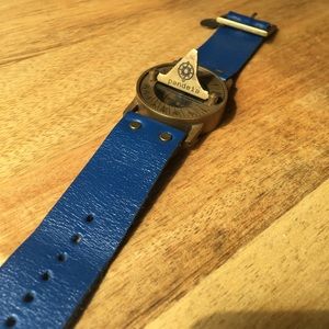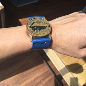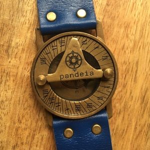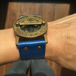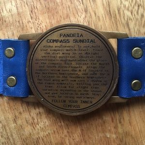 Never been worn. I purchased this from Free People but the brand is Pandeia. Escape the boundaries of time with this unique compass sundial watch. Made of brass and handcrafted leather, this time piece inspired by the past is sure to be as unique as the free spirit wearing it. Variations in color will occur due to the natural materials used. Each piece is numbered for authenticity on a hand stamped brass tag and instructions for use are engraved on the back. PLEASE NOTE - COLOR IS COBALT BLUE