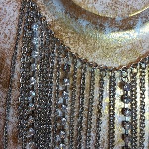 Choker. 16.5" long. Silver chains and rhinestones dangle from this Choker. I found 1 Rhinestone missing. See last pic. Very hard to see when on. Can easily be reset. Other than missing stone, it's in perfect condition.