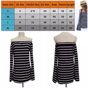 ➖ Style: Striped off the shoulder top with slash/boat neck & baby bell long sleeves. Very comfy & stretchy! See measurements.