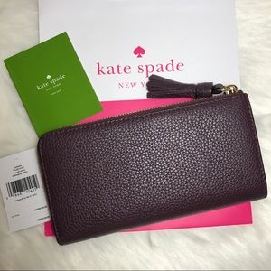 Debuted on 6/17/2017.MSRP $139 Color: Mahogany (902) Material: Crosshatched Leather Style#: WLRU3107 Zip-Around Wallet w/ Tassel Zipper Pull Large Exterior Snap Pocket w/ Flap 14K Gold-Plated Hardware Embossed Kate Spade New York Signature & Spade (Front)Kate Spade New York Signature Dark Red Jacquard Print (Interior) Interior: 12 Credit Card Slots, 2 Billfolds, 3 Slip Pockets & a Zippered Change Compartment (approx.): 8" L x 4" H x 1" D Comes from a clean, smoke-free home. Great deal
