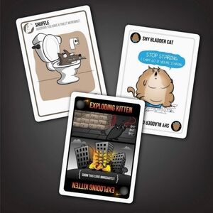 Exploding Kittens is a kitty-powered version of Russian Roulette. Players take turns drawing cards until someone draws an exploding kitten and loses the game. The deck is made up of cards that let you avoid exploding by peeking at cards before you draw, forcing your opponent to draw multiple cards, or shuffling the deck