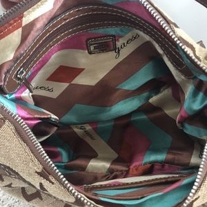 Authentic Guess bag with the G logo stitched in all over. Satin, colorful inside. This bag is the perfect size and design for everyday use! It makes the perfect completion to just about any outfit!
