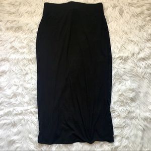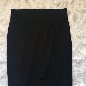 Very stylish and sexy black maxi skirt! Size 1! Has a stretch elastic waistband and the skirt has it draped creating a front slit! Brand new without tags!