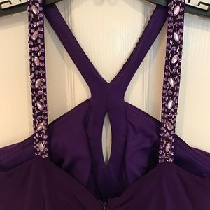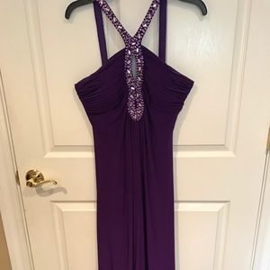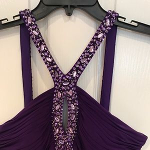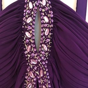 Gorgeous vibrant purple floor length gown adorned with gems on the straps and down the center. Has gathered back and a very flattering loose fit. Worn once , great condition!