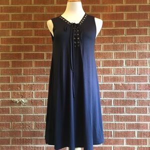 Brand new with tags. Size small. Adorable lace up neckline with grommet detailing. A flattering loose fitting dress - would be cute with leggings and a cardigan as you transition into fall as well. Navy blue grommet lace up sleeveless dress.