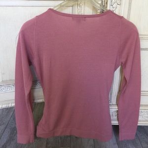 Ann Taylor light-weight sweater is 24.5" in length mid-back, 37" around bustline underarms. Long sleeves are 13" in circumference tapering to 6" in circumference at wrist. 24" in circumference slightly scooped neck line. Waist is 30" around, hip measurement is 35" around. Ruched, slanted panel in front covers tummy. Very soft 100% extra-fine merino wool. Washable.
